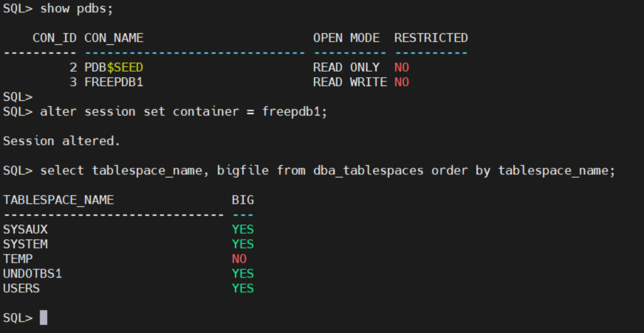 SQL> select tablespace_name, bigfile from dba_tablespaces order by tablespace_name;
