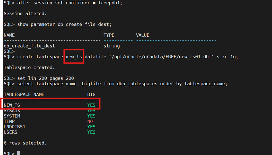 SQL> create tablespace new_ts datafile '/opt/oracle/oradata/FREE/new_ts01.dbf' size 1g;