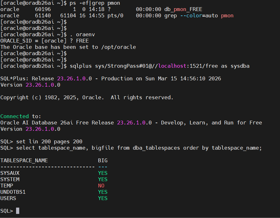 [oracle@oradb26ai ~]$ sqlplus sys/StrongPass#01@//localhost:1521/free as sysdba