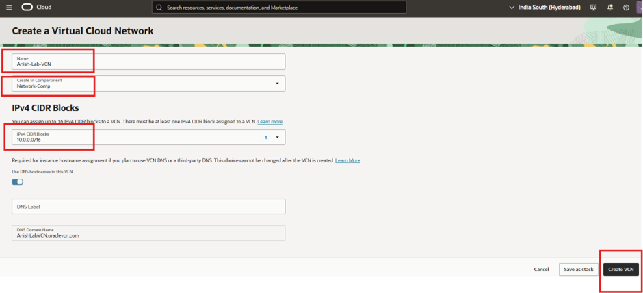 Step 3 — Create the VCN (Name + IPv4 CIDR)