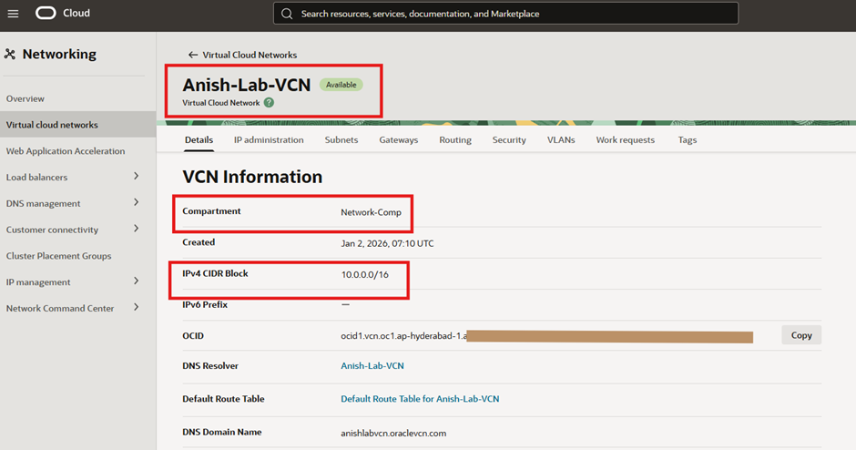 Capture the VCN OCID if you plan to automate (Terraform/CLI) later. By default, OCI also creates some default networking components: