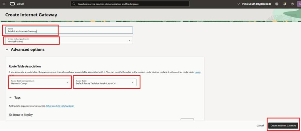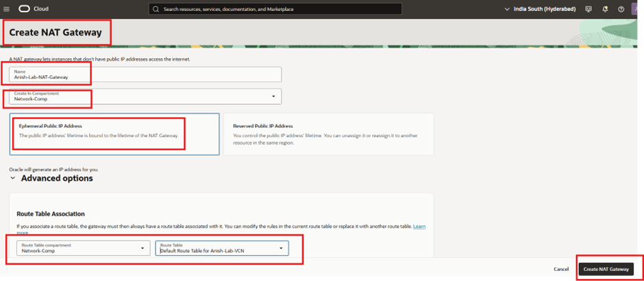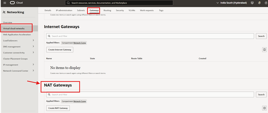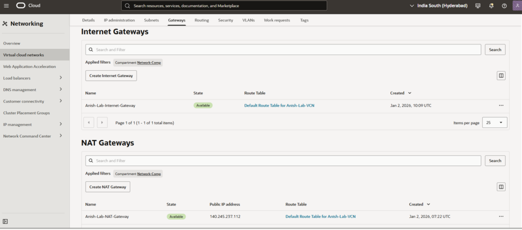 Validate IGW and NAT Gateway availability. State: Available Check Gateways listed under correct compartment NAT Gateway shows assigned public IP